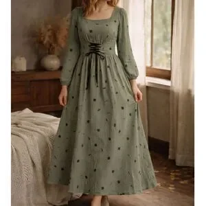 sage green dress, botanical dress, cottagecore dress, maxi dress women, corset waist dress, dark academia dress, minimalist dress, long sleeve maxi dress, earthy tone dress, flowy maxi dress, fall transition dress, vintage inspired dress, romantic casual dress
