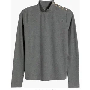 Capture effortless glamour with this rib-knit top featuring a posh mock neck embellished with gleaming goldtone buttons.