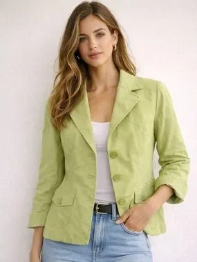 Fresh, vibrant lime green blazer that instantly elevates any outfit. This Italian-made piece has a structured yet feminine silhouette that cinches slightly at the waist for a flattering fit.