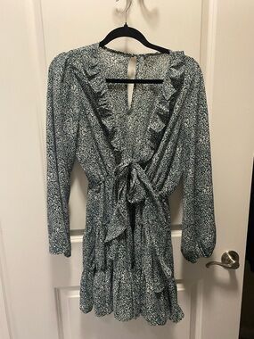 Flattering green floral mini dress with feminine ruffle trim. Designed with a tie-waist for a customizable fit and a soft V-neck for subtle shape. Long sleeves and a tiered skirt deliver graceful movement. Ideal for weekend plans or daytime events.