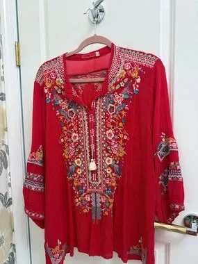 Johnny Was Crimson Red Embroidered Boho Tunic