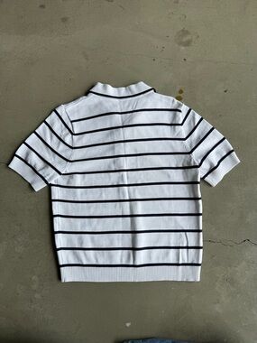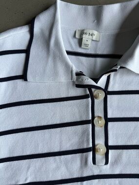 Chic striped polo sweater with a structured collar and button detail for a polished look. Soft, stretchy knit that’s breathable and comfortable—perfect for spring/summer styling or layering. Worn once and in like new condition.