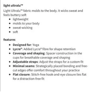 Lounge-worthy comfort meets adjustable straps and cups that provide shape and coverage. Light ultralu fabric molds to the body. It wicks sweat and feels buttery soft.