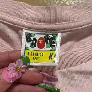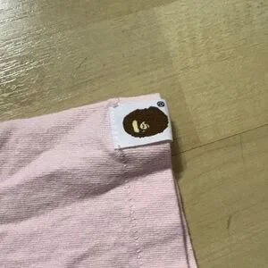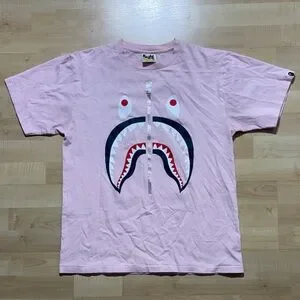 Iconic Bape shark graphic on a pink tee. Central silver zipper runs through the design. Red and black accents highlight the shark mouth and eyes. Soft short-sleeve streetwear piece.