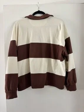 Oversized rugby pullover with wide horizontal stripes. Chest pocket and buttoned collar. Soft, casual fit. Classic two-tone brown and cream design. hardly worn due small bit fits like a little bigger