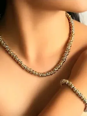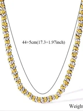 Two-tone beaded necklace with matching bracelet. Alternating gold and silver rounded beads. Secure lobster clasp with extender. Polished finish for a modern look.