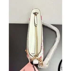 This authentic Juicy Couture shoulder bag features the vibrant Cherry On Top print in a white multi-color palette. The exterior is crafted from durable faux leather with a repeating cherry and logo pattern, accented by a 3D pink JC logo and a matching enamel cherry charm.