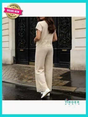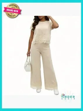 Knit Lace Pattern Top and Pants Set Chic Casual Loungewear Relaxed Fit