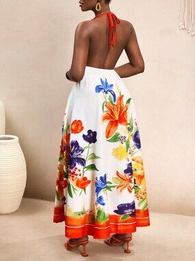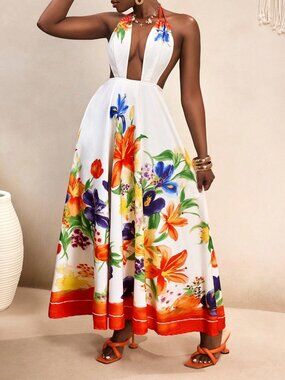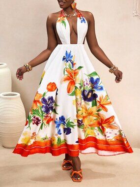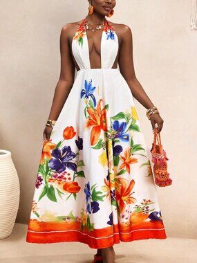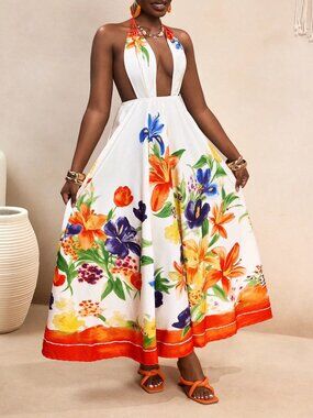 White Sexy Women's Plant-Print Suspender Wrap Dress