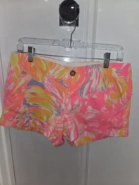 Vibrant tropical-print high-waist shorts by Lilly Pulitzer. Neon pink base with bold yellow and light gray leaf motifs. Flat front with button closure. Lightweight, breezy fabric ideal for summer outings. Florida