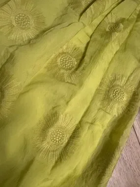Bright lemon-green embroidered maxi dress by kate spade. Sleeveless V-neck with soft shoulder ruffle detail. Self-tie waist for a tailored fit. Flowy skirt with subtle floral embroidery. Lightweight and breezy for warm days.