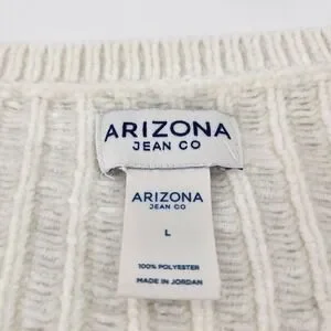 Keywords: Arizona Jean Co, knit sweater, white sweater, womens sweater, v neck sweater, long sleeve sweater, lightweight sweater, casual sweater, ribbed sweater, relaxed fit, size L, polyester sweater, fall fashion, winter fashion