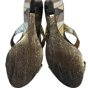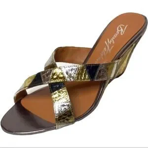 Beverly Feldman Metallic Gold Silver Wedge Peep Toe Sandals Shoes 7M
