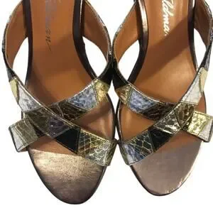 The mixed-metal patchwork and that classic Beverly Feldman silhouette give off a great "vintage glam" meets "modern metallic" vibe. Gorgeous four tone metallic slip on wedge sandals are in like new condition. Only real signs of wear are on soles. Gold, black, bronze and silver and reptile embossed leather. 3 inch wedge.