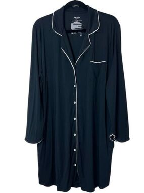 Soft black nightshirt with contrast white piping for a timeless look. Button-front design with a notched collar and chest pocket for relaxed style. Lightweight, breathable fabric for comfortable sleep and lounging. Elegant black color pairs easily with any sleep wardrobe.