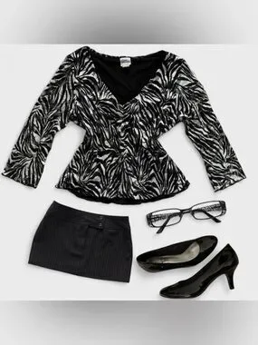 this Giorgio Fiorlini blouse has 3/4 sleeves and a super flattering v cut neck line !! cute Y2K zebra print :) this top would be a great work shirt for an office girly or be worn casual with a pair of low cut jeans :)