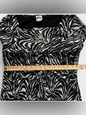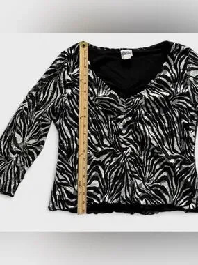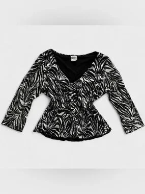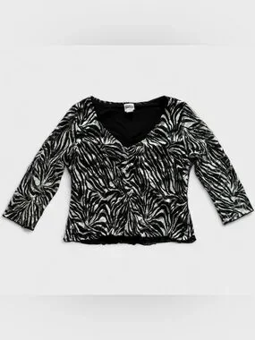 Y2K Giorgio Fiorlini Black & White Zebra Print 3/4 Sleeve Lace V Cut Blouse Top