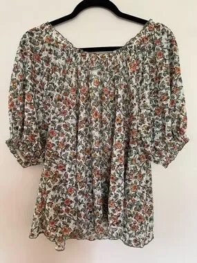 Lightweight floral blouse with puff sleeves. Button-front placket and scoop neckline. Breezy, relaxed fit with gathered sleeve cuffs. Feminine and easy to wear.