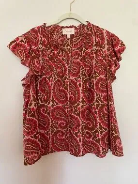 Vibrant paisley print blouse from Cleobella. Soft flutter sleeves with ruffle details. Lightweight, breezy fabric. Easy pull-on styling with gentle gathers at the neckline. Casual yet feminine look for everyday wear.