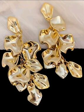 Statement Anthropologie earrings with sculpted, fluid gold drops. Shiny polished finish creates eye-catching movement. Bold yet wearable for special occasions or elevated daily looks.