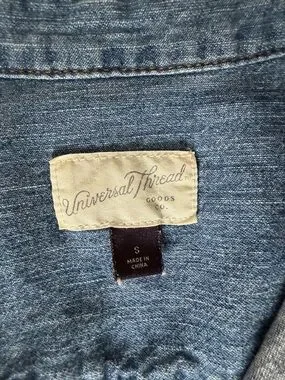 Button-up denim dress with a relaxed shirt silhouette. Chest label shows Universal Thread branding. Soft medium-blue denim with visible topstitch details.