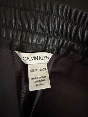 Calvin Klein faux leather joggers in black. Elastic waistband with drawstring. Side pockets and tapered ankle. Smooth glossy finish for a contemporary style.
