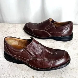 Thsee Johnston and Murphy Brown Sheepskin Leather Slip On Sneakers in men's size 10.5 offer a stylish and comfortable option for casual wear, workwear, or travel. Uppers, lining and insoles are soft sheepskin leather. Detailed layered and embroidered accents, along with comfy elastic gores, provide a unique and fashionable touch to their classic loafer style. These Johnston & Murphy shoes are a versatile and attractive choice that will last for many years. Gently preowned condition.