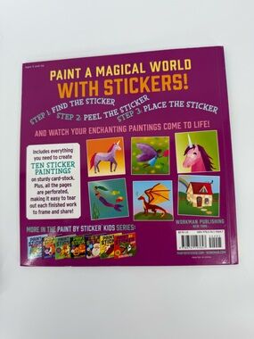 Paint By Sticker Kids Unicorns & Magic activity kit featuring a pink unicorn design. Includes numbered stickers and glitter accents for creative, screen-free fun. Easy step-by-step placement to build colorful scenes. Great for developing focus and fine motor skills.