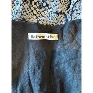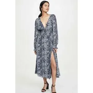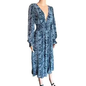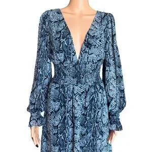 Reformation Aries Midi Dress Blue Snakeskin Smocked Plunge Long Sleeve Small