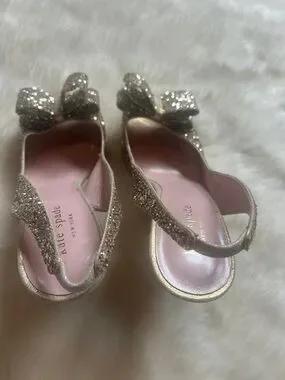 Sparkling glitter upper with a decorative bow at the toe. Open peep-toe and slingback strap. Shimmering gold finish for dressy occasions. Sample written on the bottom of the shoes.