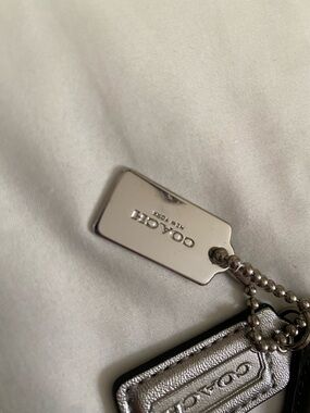 Coach leather tag keychain with a glossy black tag and metallic silver tag and metal tag. Polished silver ball chain and hardware. Embossed Coach logo on both leather tags. Compact and stylish accessory for keys or bags. Please message with any questions :)