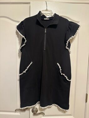 Playful black dress with white ruffle trim. Half-zip front for easy wear. Short flutter sleeves and front pockets. Simple, everyday casual style. Like new condition.