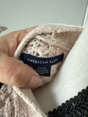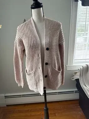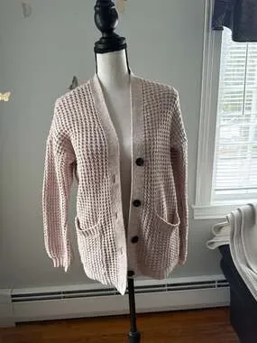 American Eagle waffle knit cardigan in a soft blush pink. Button-up front with dark contrast buttons. Two front patch pockets. Relaxed fit with dropped shoulders and ribbed cuffs. Soft textured material for a cozy feel. Size small. Pre-owned condition.