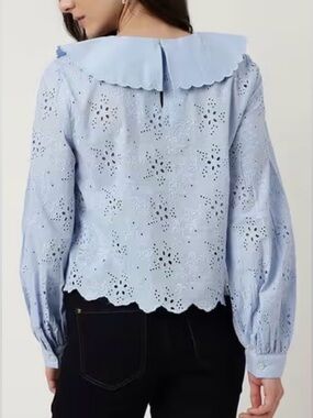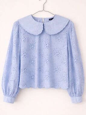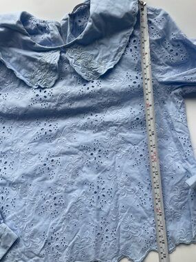 Soft, romantic piece with a true cottage core meets vintage feminine feel. This light blue eyelet blouse features delicate embroidered detailing throughout, a statement oversized Peter Pan collar, and a gently flowy silhouette that feels effortless and airy.
