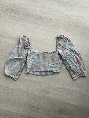 Soft pastel floral crop top with ruched front. Voluminous puff sleeves add drama. Lightweight, airy fabric for easy wear. Feminine and versatile for day or night.