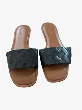 Sleek Aldo slides with a textured woven strap. Smooth brown footbed for comfortable wear. Easy slip-on style for everyday outfits.
