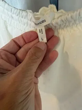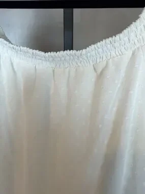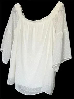 (RR) Maurice’s Lightweight white off-shoulder blouse with delicate Swiss dot texture. Breathable fabric and elasticized neckline for a comfortable fit. Sheer sleeves add a feminine, airy look. Versatile top that pairs easily with jeans or skirts.