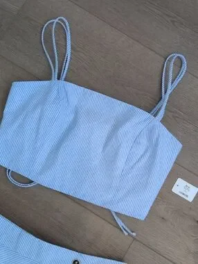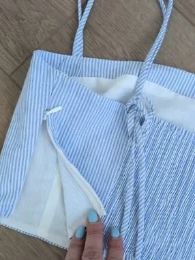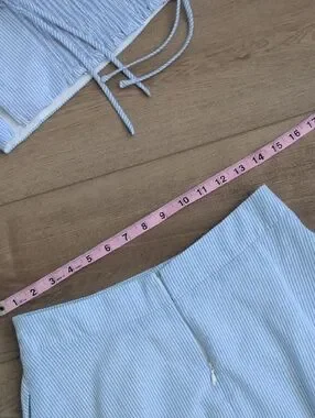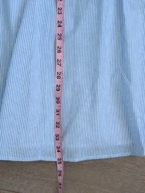 Light blue striped maxi skirt with a flattering A-line silhouette. Soft, lightweight fabric for comfortable all-day wear. Subtle vertical stripes create a clean, elongating look. Easy to style for casual or dressy summer outfits. Two piece set. Tags removed but never worn other than trying on.