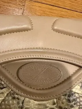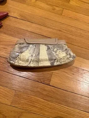 Chic clutch with a beige leather-like upper. Snake-print panel adds textured detail. Sleek curved silhouette. Secure top flap closure. Elegant neutral palette for many outfits.
