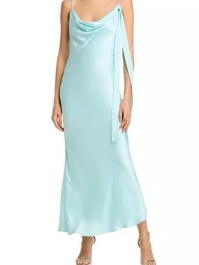 Satin slip maxi with a draped cowl neckline. Thin adjustable shoulder straps and side tie detail. Smooth, fluid silhouette that skims the body. Subtle sheen for a polished evening look.