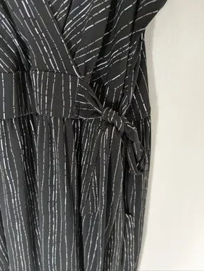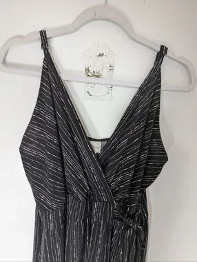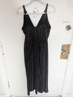 Chic black maxi dress with subtle metallic silver stripes. Features a V-neckline and a defined waist for a flattering silhouette. Lightweight, sleeveless design ideal for evening events or daytime outings.