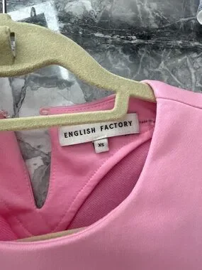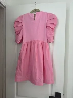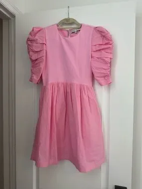 English factory pink dress with dramatic puff sleeves. Fitted bodice and gathered skirt create a classic silhouette. Lightweight fabric allows easy movement. Subtle round neckline for a clean finish.