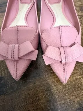 Soft pink leather flats with pointed toe. Decorative bow accent on vamp. Leather lining for smooth feel. Slip-on design for easy wear. Feminine and refined style.