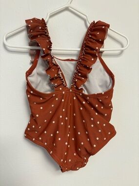 Rise Little Earthling Rust-colored one-piece swimsuit with white polka dots. Features ruffled shoulder straps and a scoop neckline. Cute and playful summer piece. Size 9-12m but fits more like 6-9m. Barely worn.