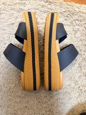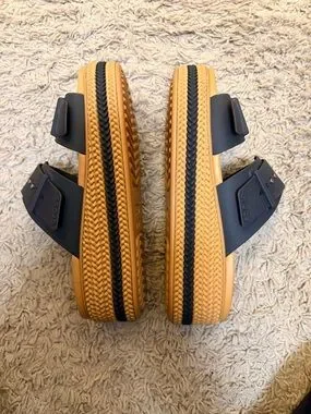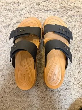 Classic two-strap slide sandal by CROCS. Soft contoured footbed for all-day comfort. Adjustable buckles for a secure fit. Lightweight and easy to wear. Only worn once for a few hours