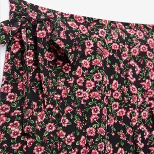 This short skirt features delicate and feminine pleat detailing. Made of a fluid silk crepe, it stands out with its forget-me-not print featuring delicate pink flowers on a black background. It has a drawstring waist for a slimmer fit and can be easily matched with your summer wardrobe.