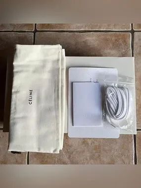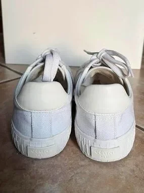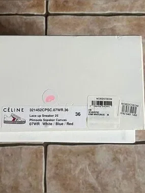 Authentic Low-top Celine sneakers. White canvas upper with red and blue chevron accents. Lace-up front and rubber sole. Sleek, casual silhouette.