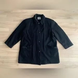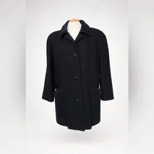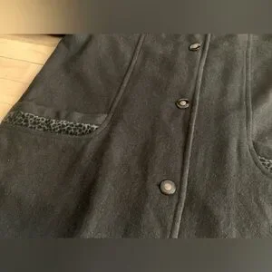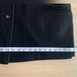 Chic vintage black wool coat with funky leopard print details on the collar and pockets. Structured silhouette with snap-button front closure and a flattering petite fit (V.I. Petite line).