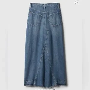 Long denim skirt from GAP. Straight silhouette with center front slit. Classic five-pocket styling and belt loops. Easy, casual styling. Just bought and it’s slightly too small. I normally wear a Gap size 6, so this runs a little small. Loved the style wish it was a little bigger.