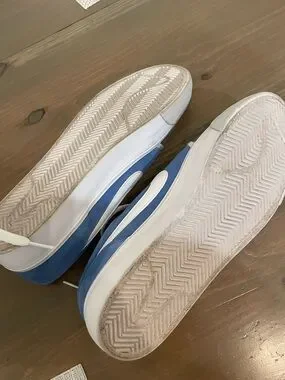 Low-top Nike skate sneakers with suede panels. Blue side panels and gray toe areas. White laces and logo accents. Simple, sporty silhouette.